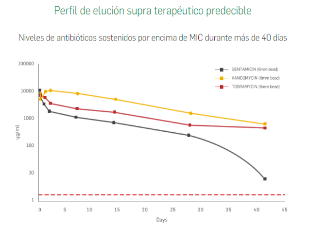 ES UN SUSTITUTO OSEO A BASE DE SULFATO CALCIO ALTAMENTE PURIFICADO QUE SE IMPREGNA CON ANTIBIOTICO BRINDANDO UNA TERAPIA EFECTIVA, FACIL Y SEGURA . PARA EL PACIENTE CON INFECCIONES MUSCULOESQUELETICAS E INFECCION DEL SITIO QUIRURGICO CON ALTO RIESGO DE COMPLICACIONES APROBADO SU USO EN TEJIDO OSEO Y TEJIDO BLANDO